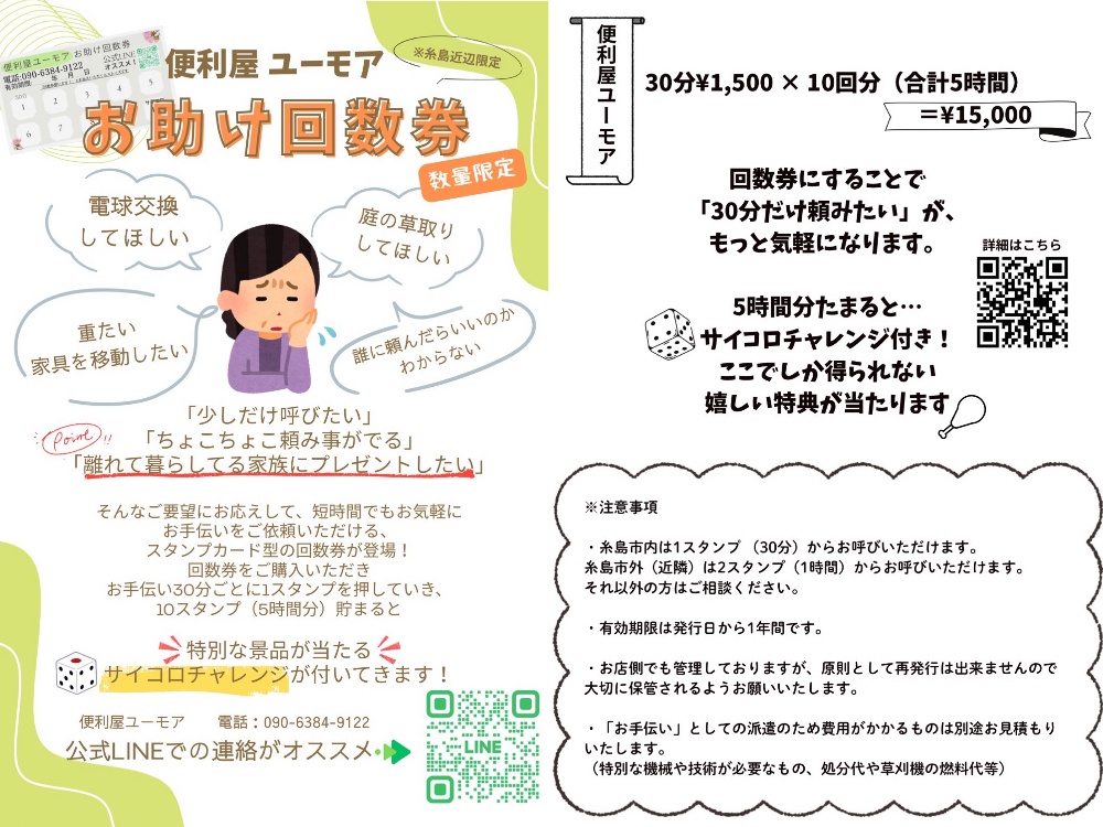 糸島市外(近隣)は2スタンプ(1時間)からお呼びいただけます。それ以外の方はご相談ください。